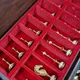 Корпус "Баталии" изготовлен из массива бука, усиленного мраморными вставками и лакированным долеритом. Декоративные элементы выполнены из полированной латуни, покрытой никелем и золотом, что придает набору блеск и элегантность. Внутри лабиринтного узора раскинулись шахматные фигуры, созданные с невероятным вниманием к деталям.
